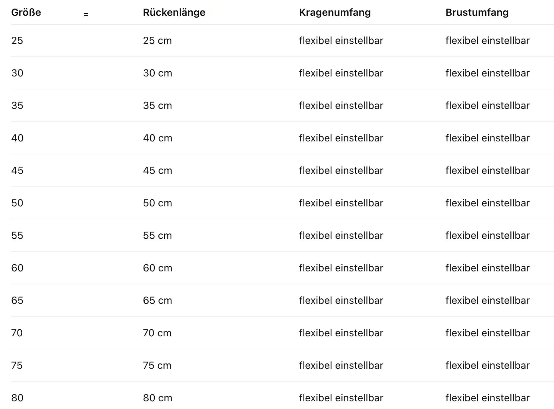 12 Größen vom Chihuahua bis zur Dogge. Alle Hundemäntel haben einen verstellbaren Bauch- und Halsbereich.